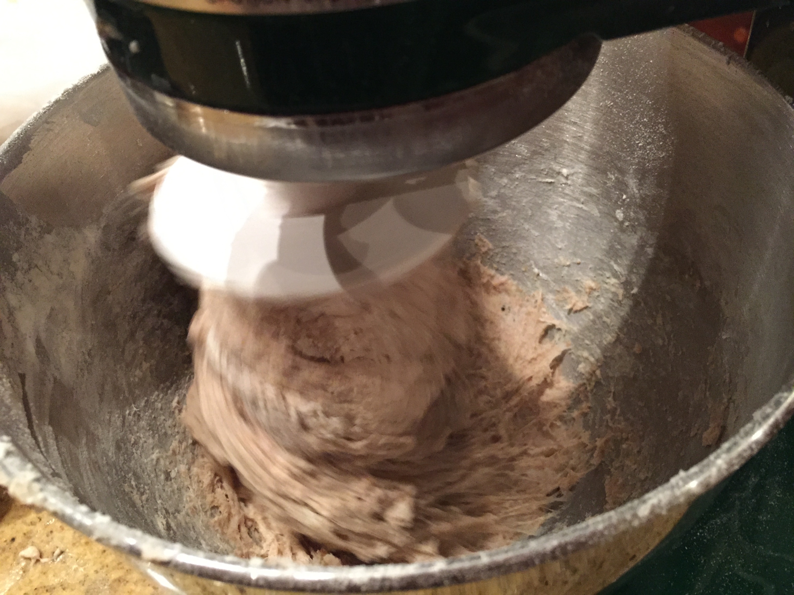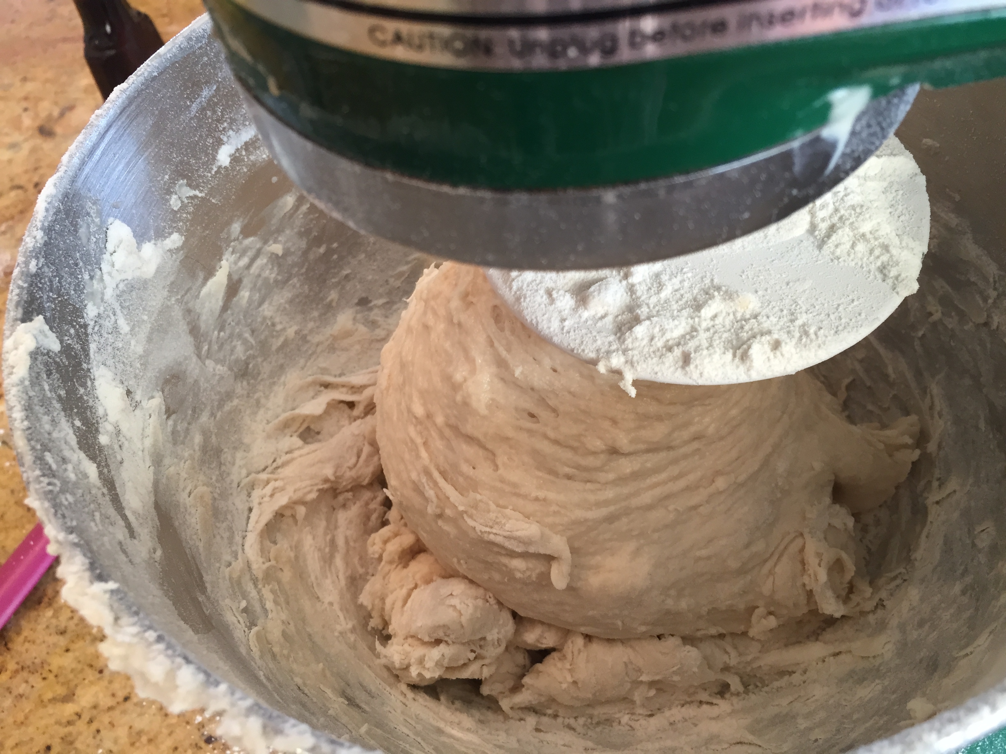When most of the flour is mixed, increase the mixer speed. Alternate adding flour, reducing mixer speed each time (otherwise the flour spews out of the bowl – the voice of experience). When you remove from the bowl it can still be slightly sticky.