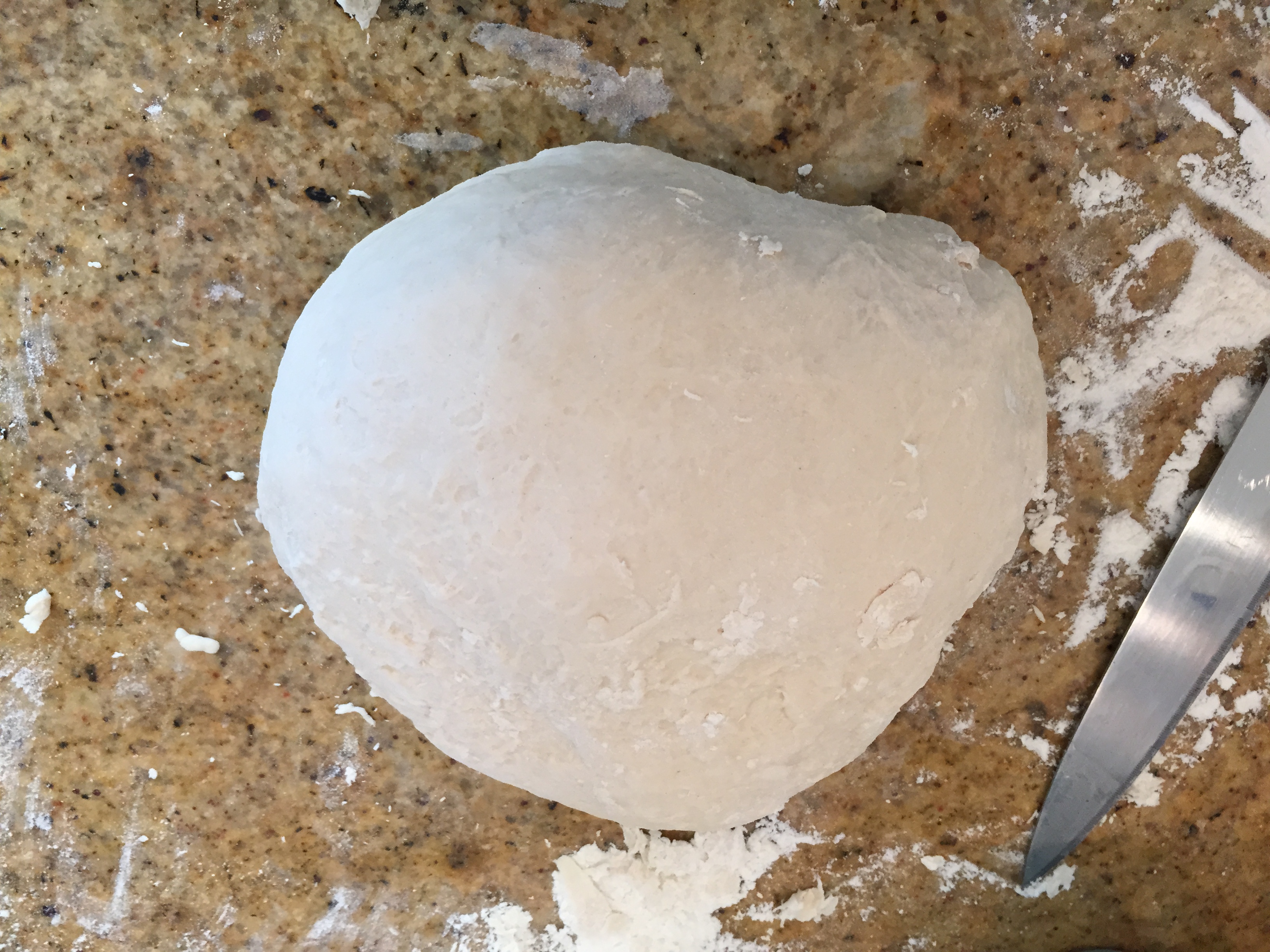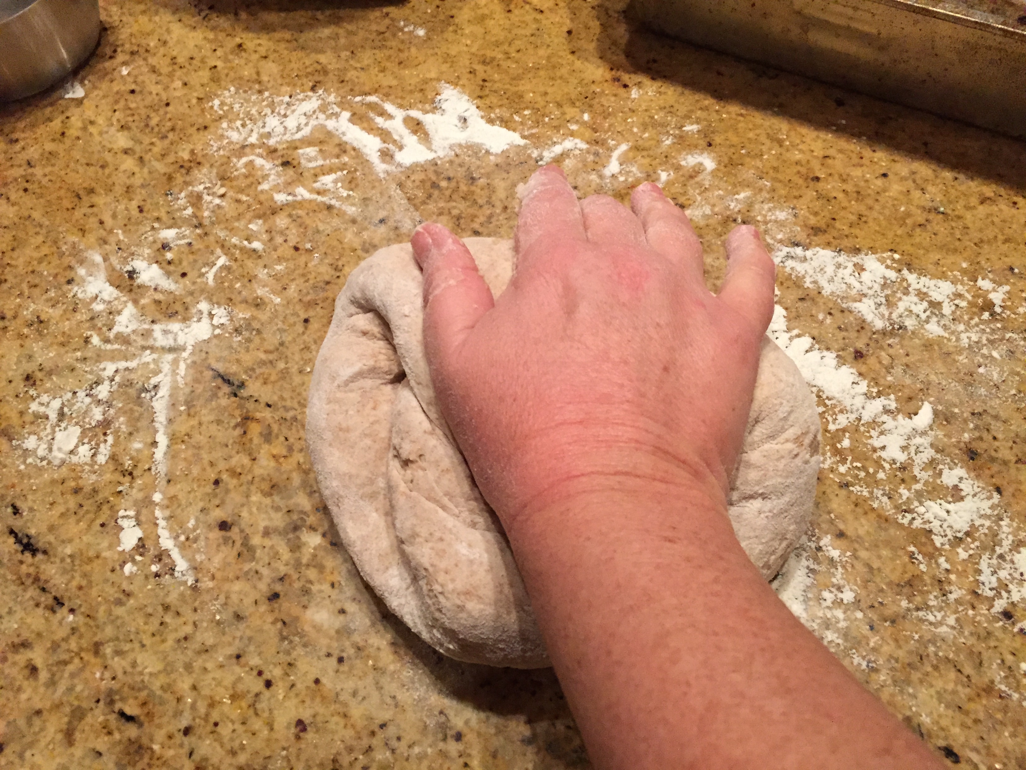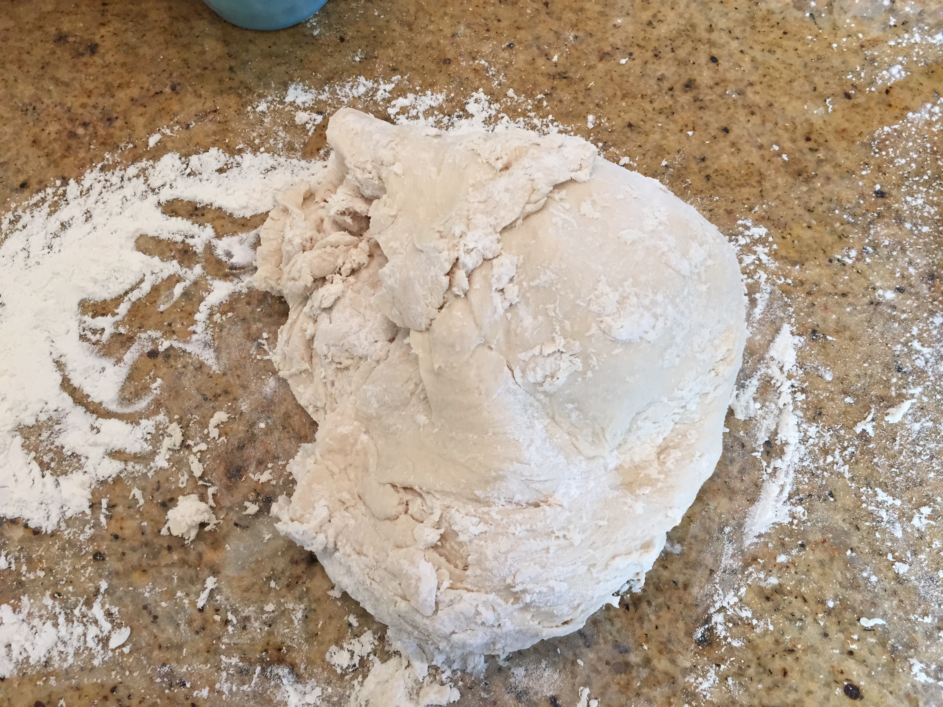Step 4: Sprinkle flour on counter top, place dough on the prepped counter, sprinkle more flour over dough and begin kneading. Knead dough about 20 times.