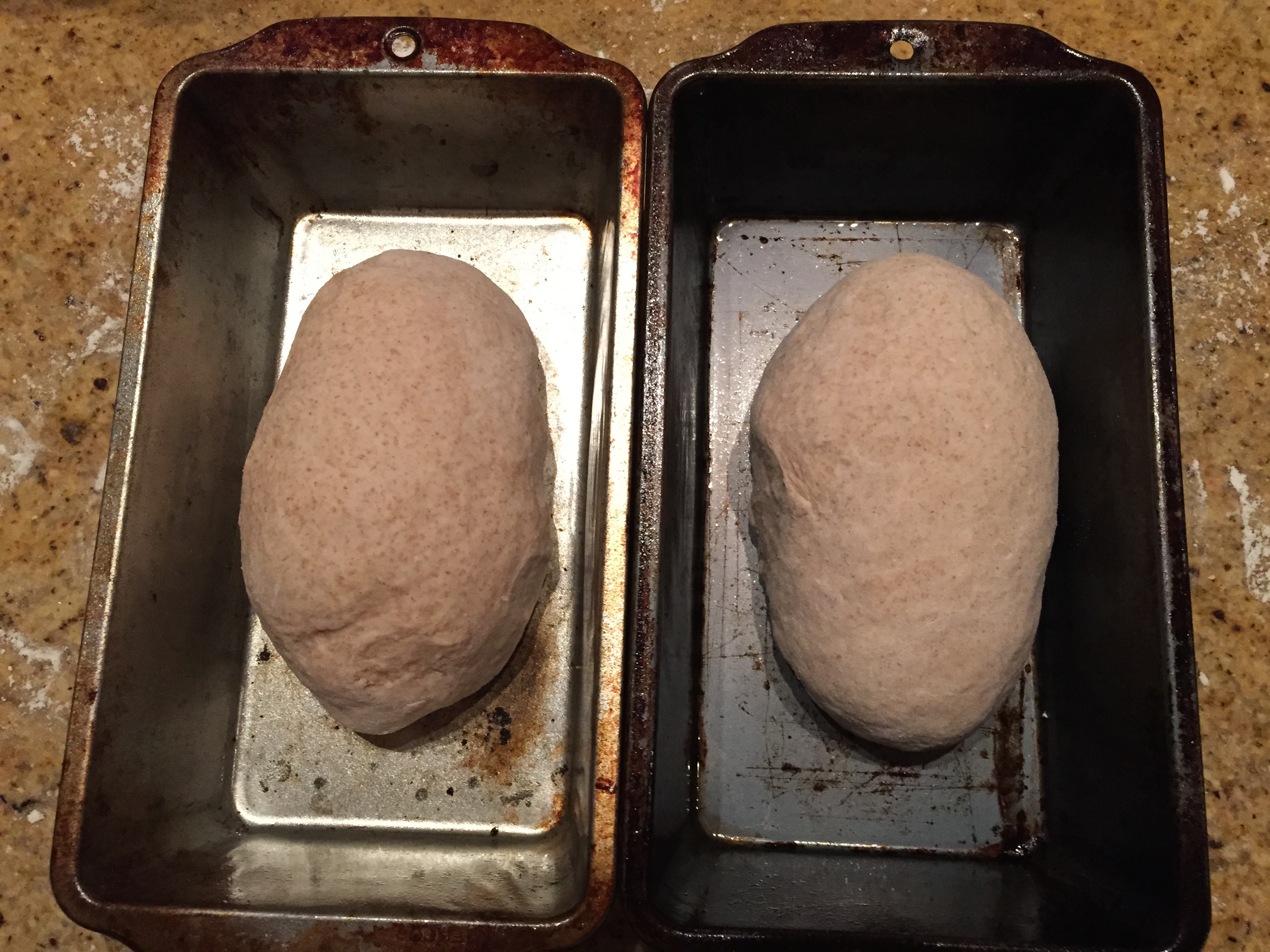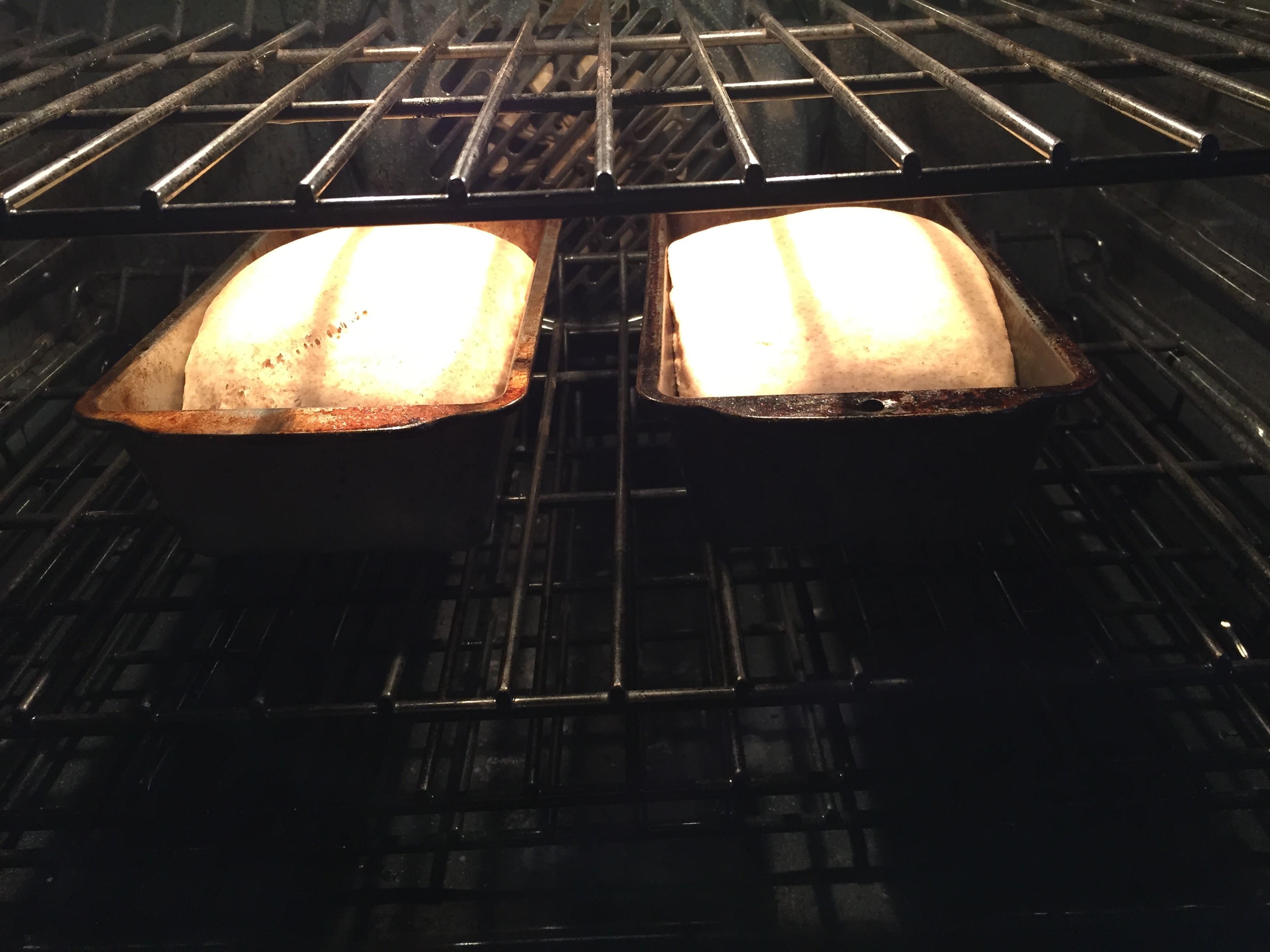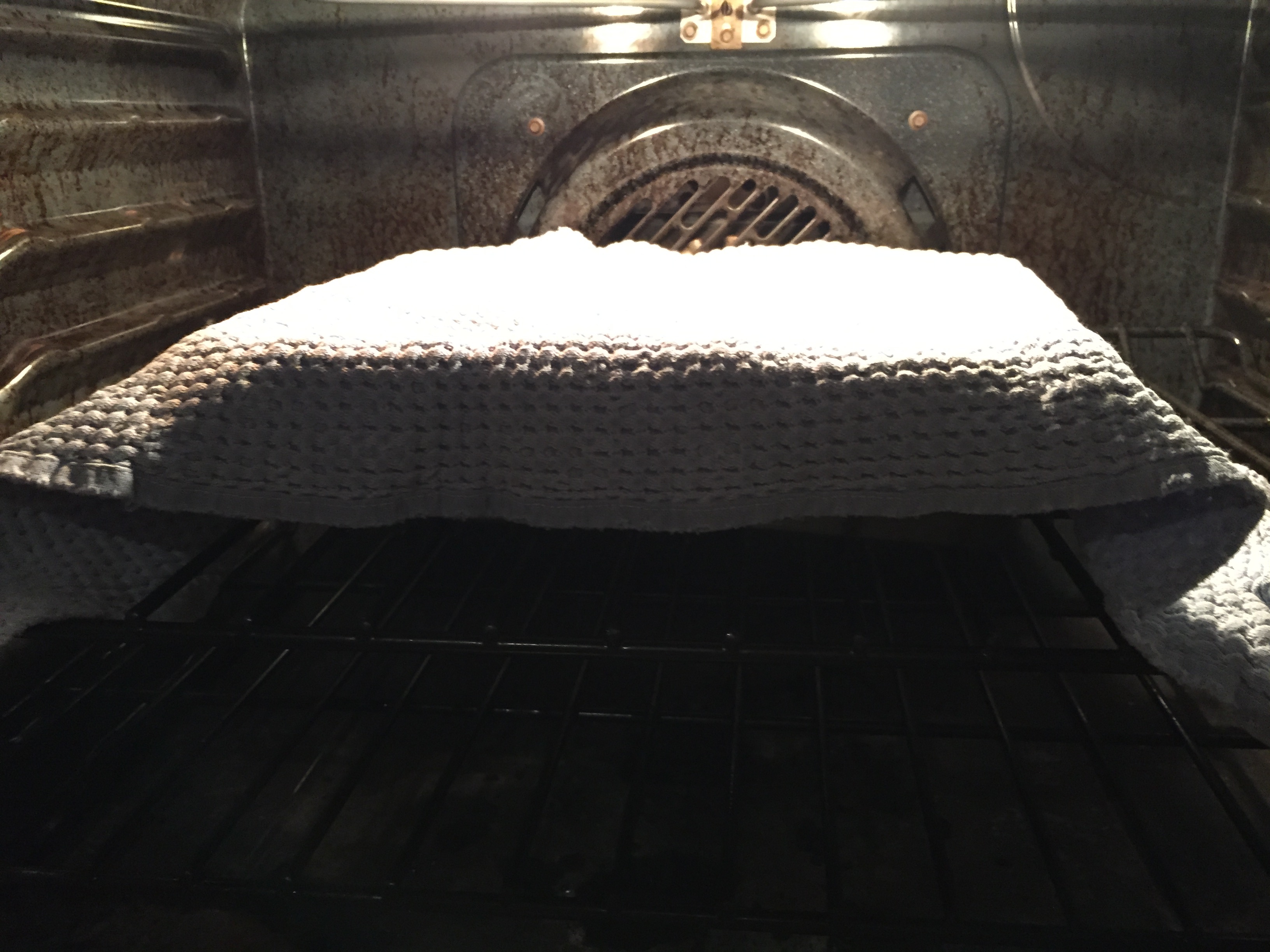 Step 6: Place loaves into greased loaf pans and place in oven to rise. I have a “proof” setting on my oven but you could preheat to low temp then turn off just to have a little heat. I cover my pans with a dish towel.