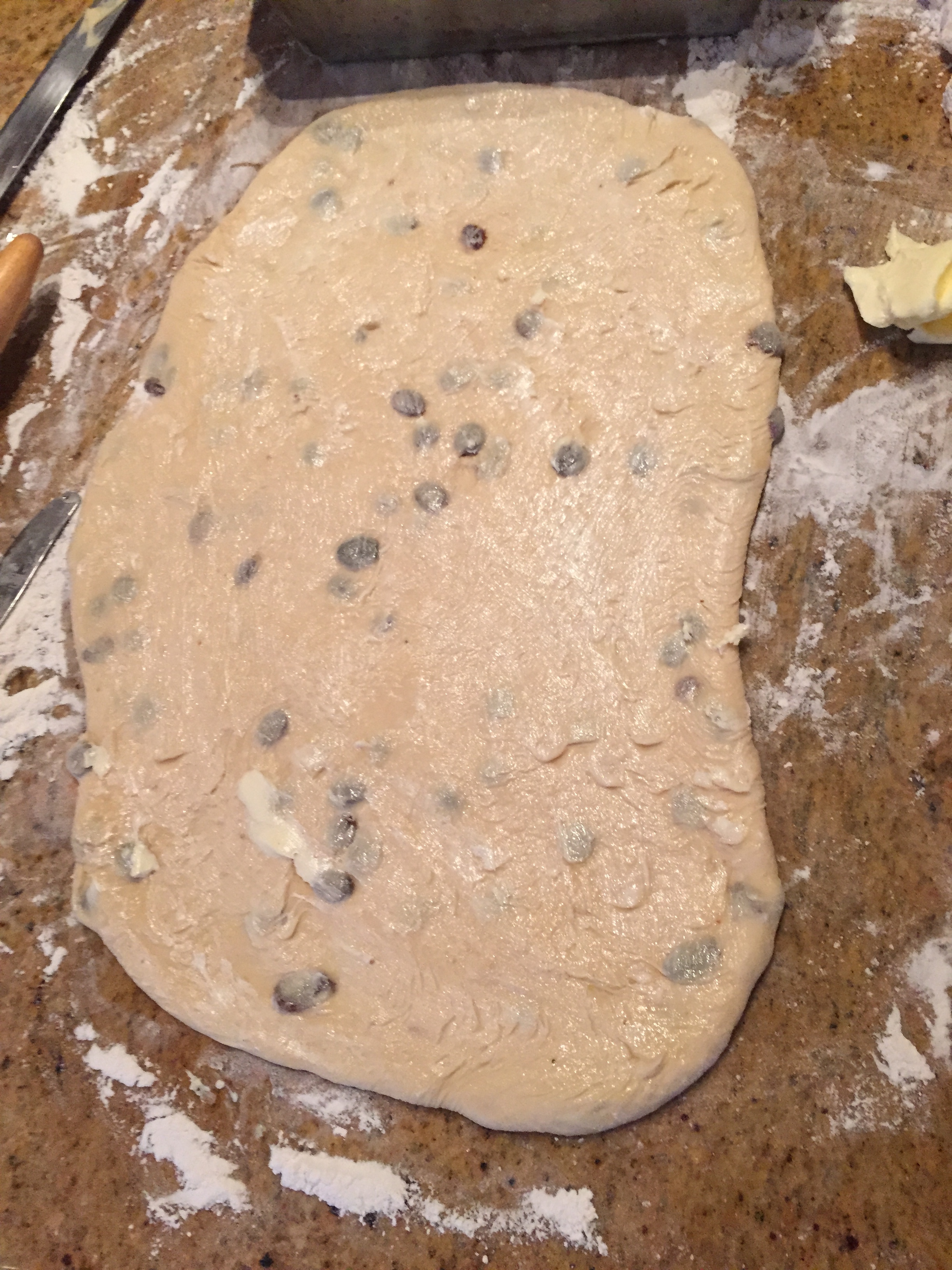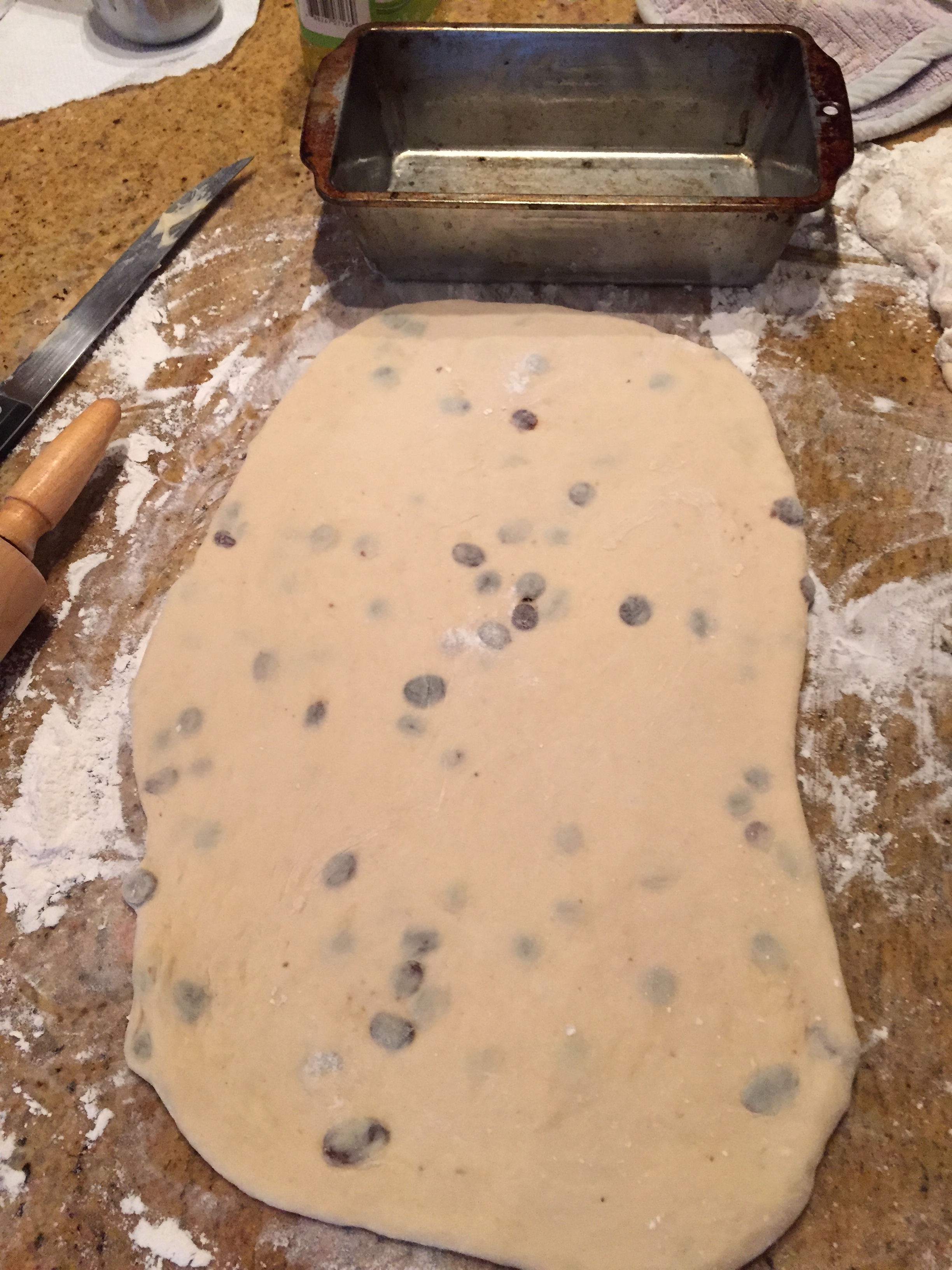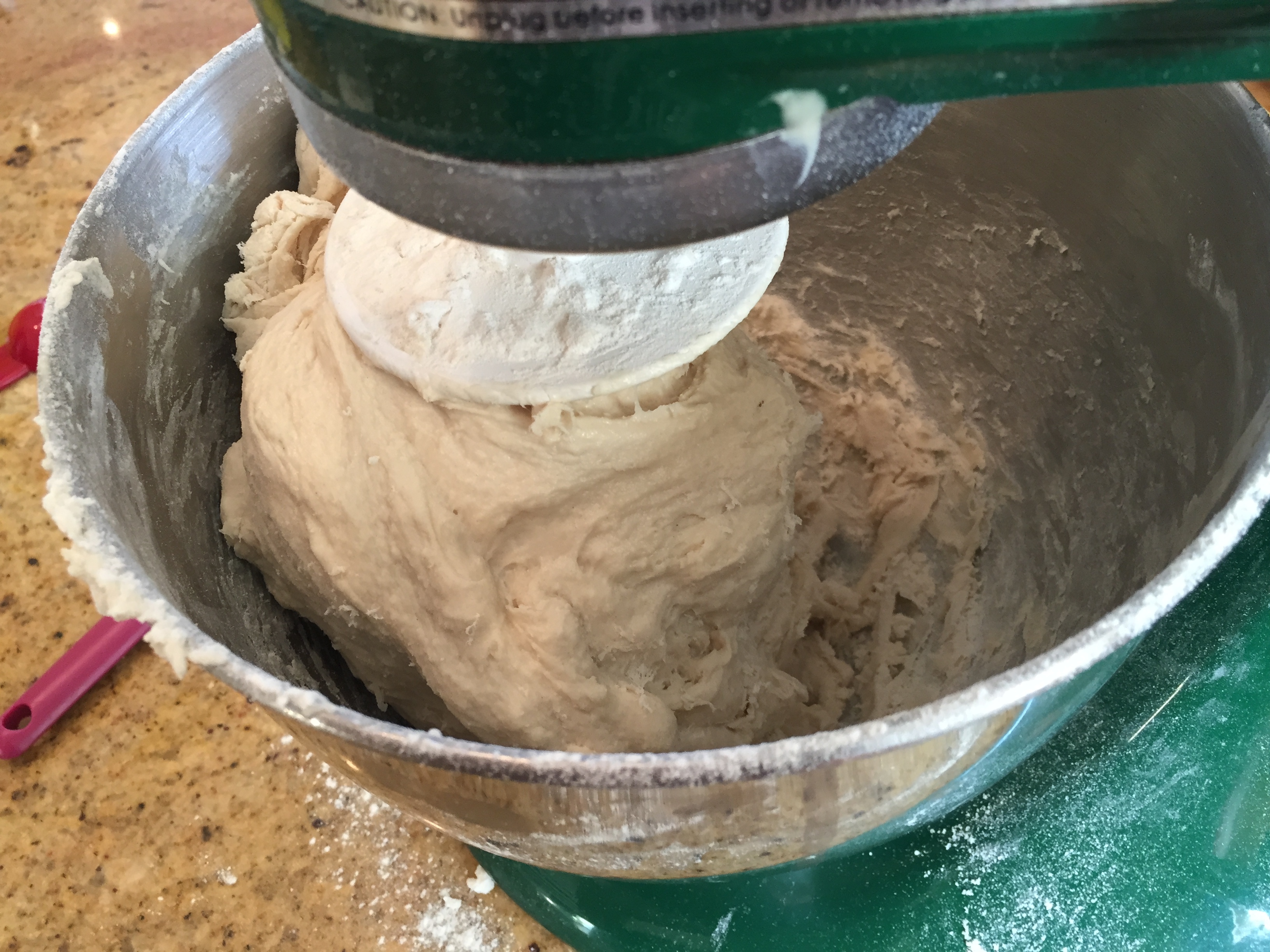 After you have added and completely mixed approximately 5 cups of flour add the raisins to the bowl and mix on slow speed. TIP: I place raisins in a small microwave safe bowl and cover with water. I microwave warming the water and allow to cool as I’m making the rest of the recipe. Drain the water from the raisins and pour into the mixture. These raisins are much more tender than raisins directly from the box. Not a bad idea for cookie recipes as well.