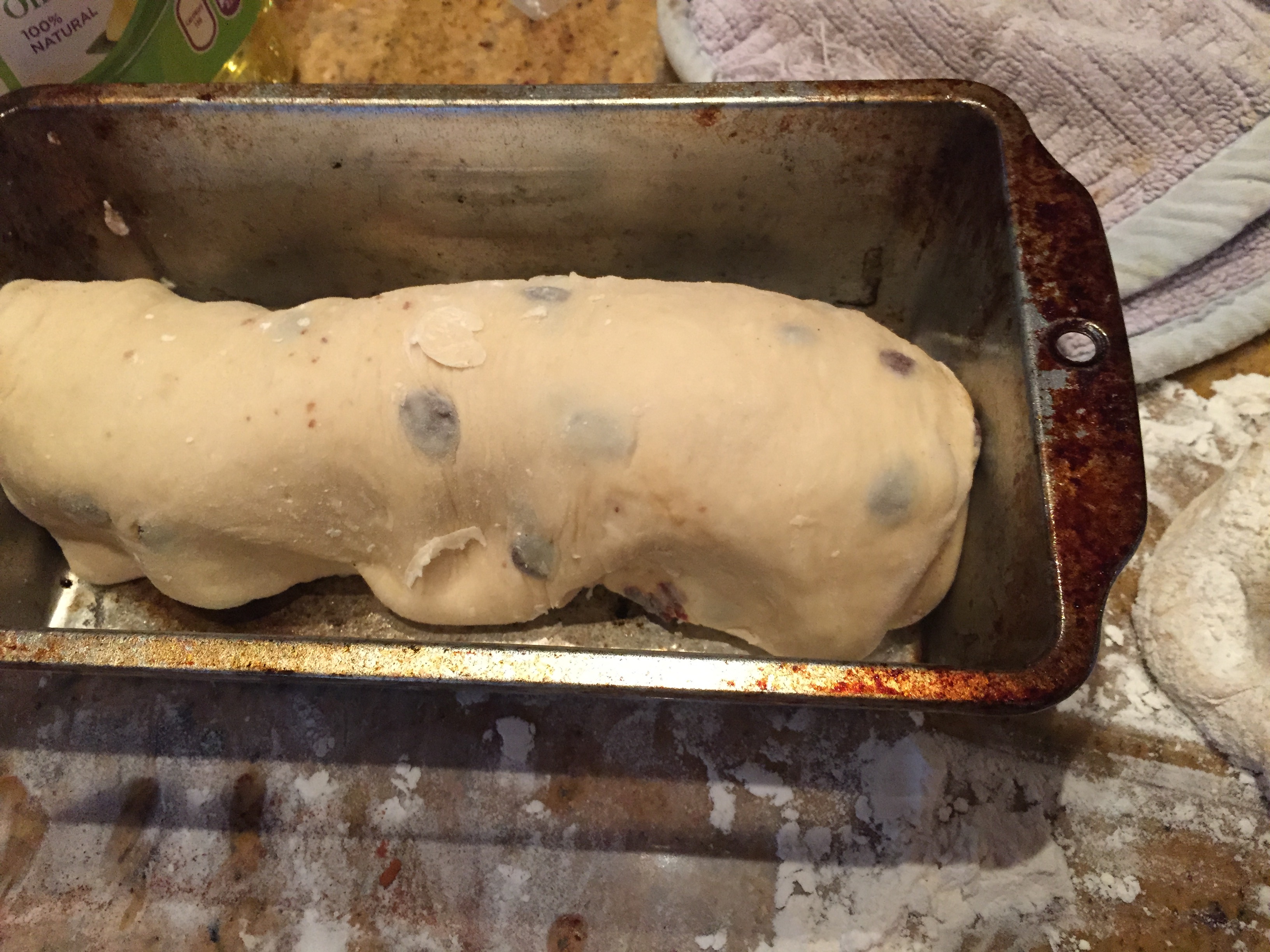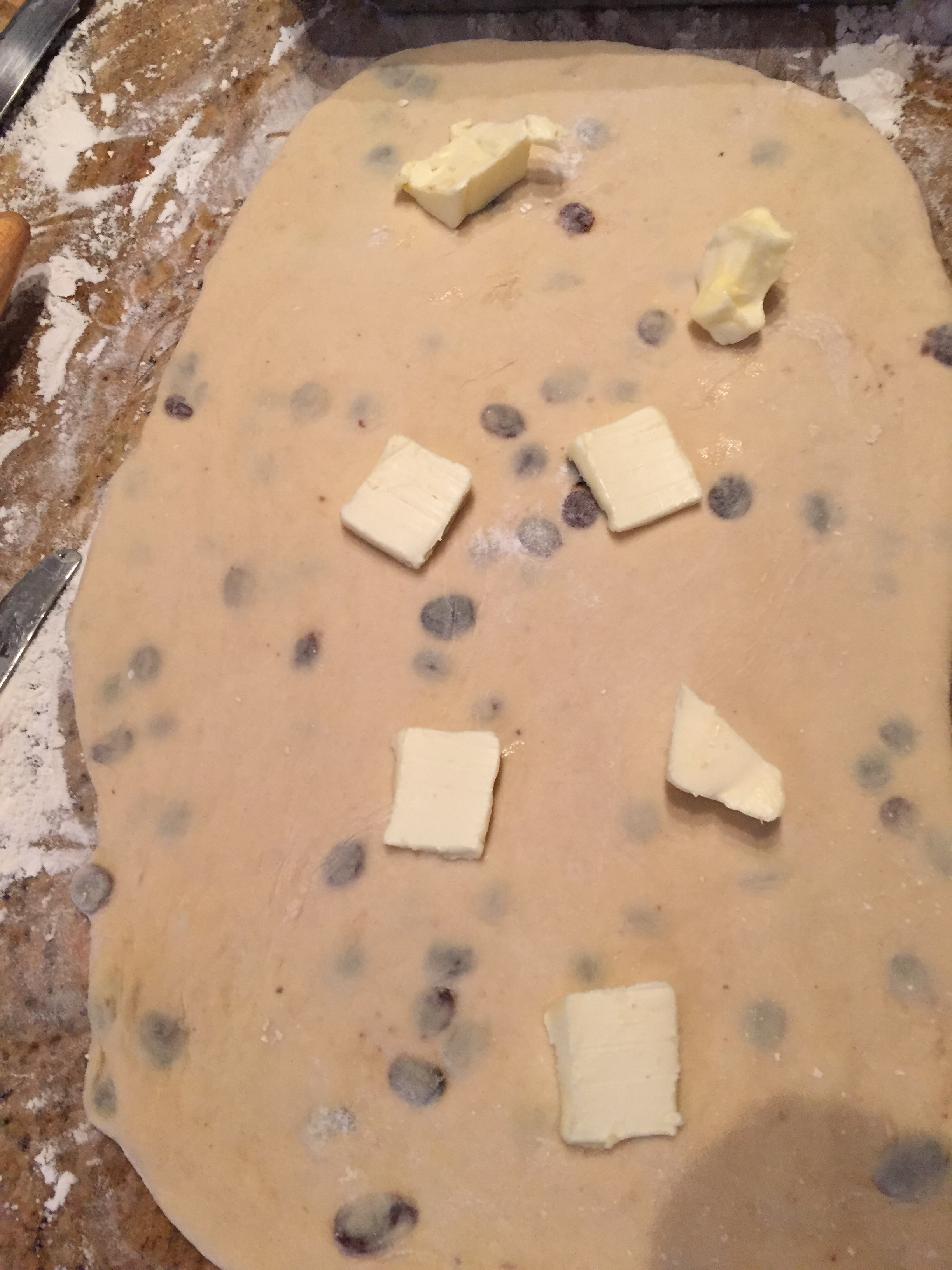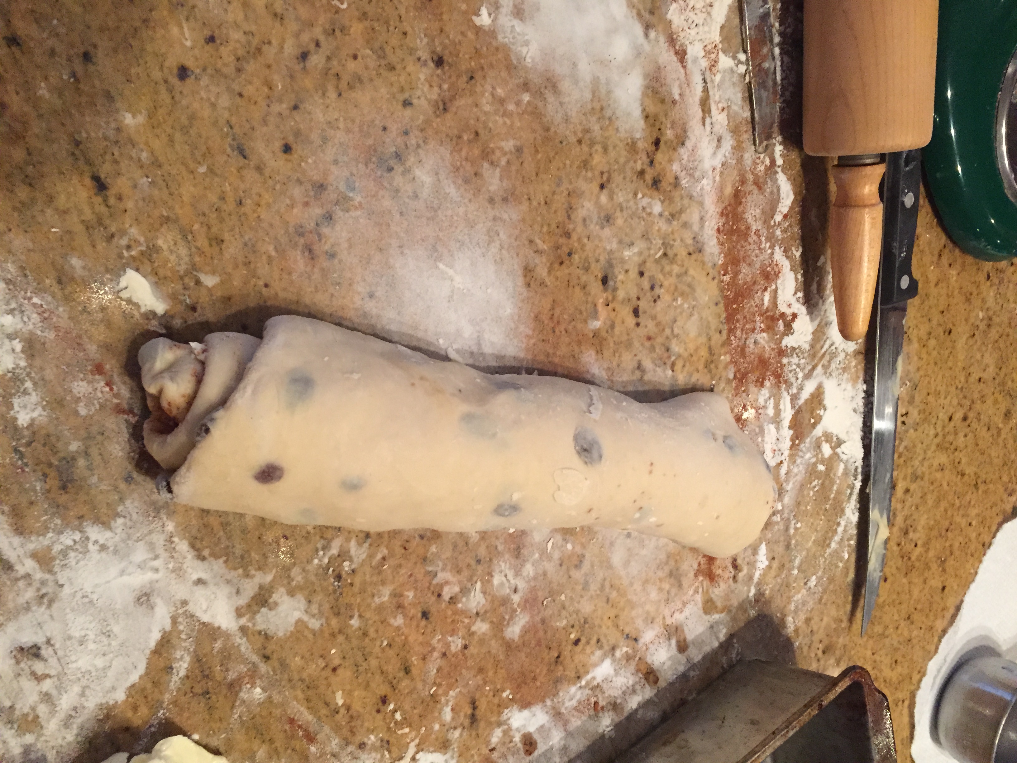 After you have added and completely mixed approximately 5 cups of flour add the raisins to the bowl and mix on slow speed. TIP: I place raisins in a small microwave safe bowl and cover with water. I microwave warming the water and allow to cool as I’m making the rest of the recipe. Drain the water from the raisins and pour into the mixture. These raisins are much more tender than raisins directly from the box. Not a bad idea for cookie recipes as well.