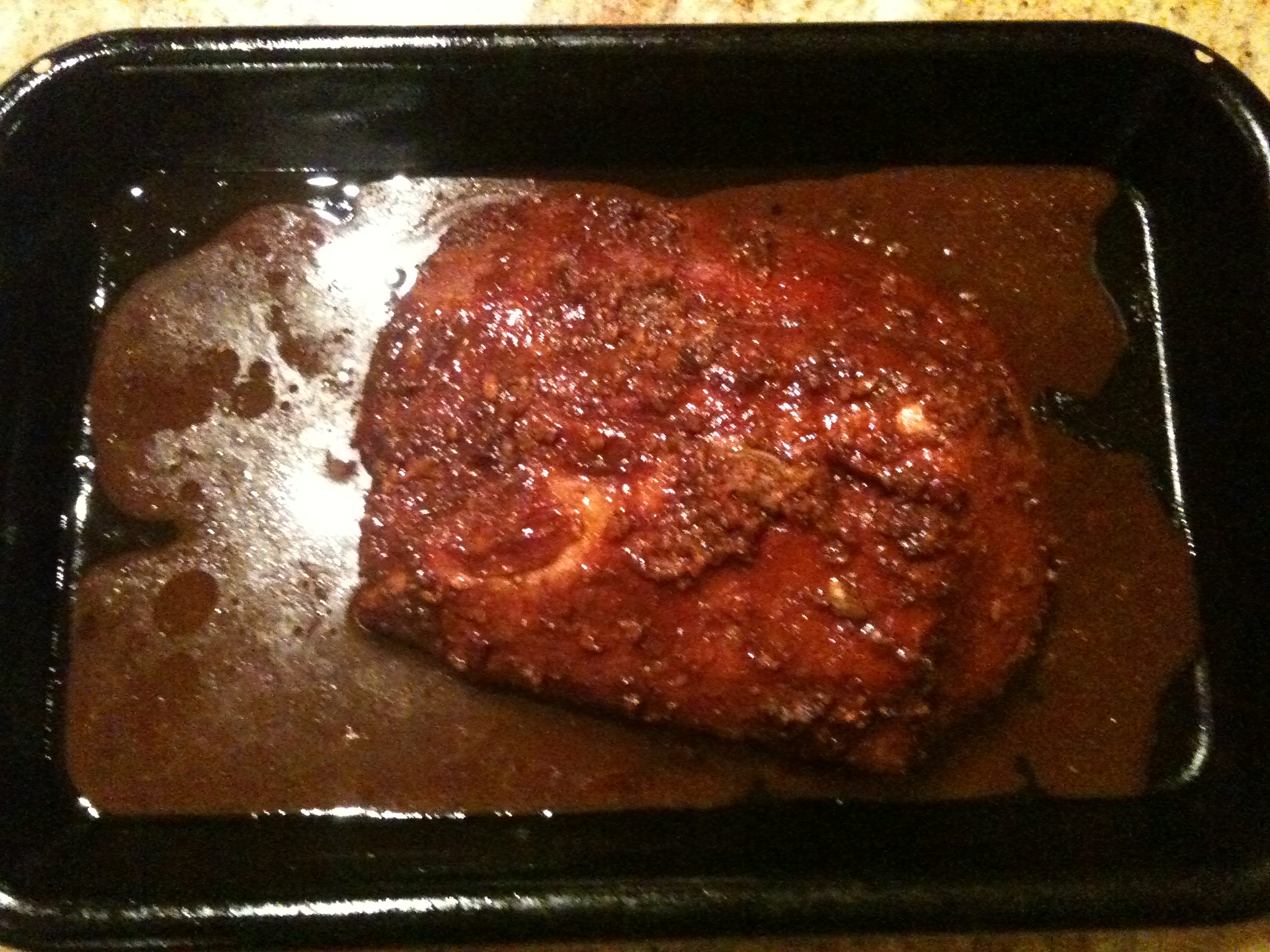 Remove from oven, pour remaining marinade over meat. Cover. Reduce heat to 350°. Bake until tender, approximately 1 hour.